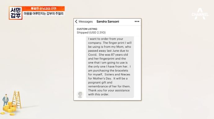 공기업에 다니던 중 사랑하는 사람과 결혼을 하고 소중한 아이가 찾아왔지만, 엄마가 처음이었던 수정 씨는 모든 것이 벅찼다고 합니다. 해외 온라인 사이트로 창업을 한 수정 씨는 어느 날 미국에 거주하는 ‘캐롤’이라는 손님에게 죽은 남편의 지문으로 목걸이를 만들어 달라는 주문을 받게 됐다고 합니다.