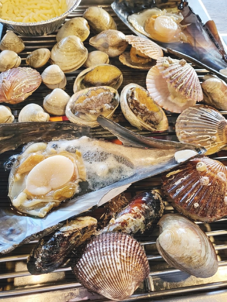 *전복/키조개/가리비/소라등 10여가지의 싱싱한 조개들과 삼겹살/갈비/오리고기 와 20영가지의 각종 야채